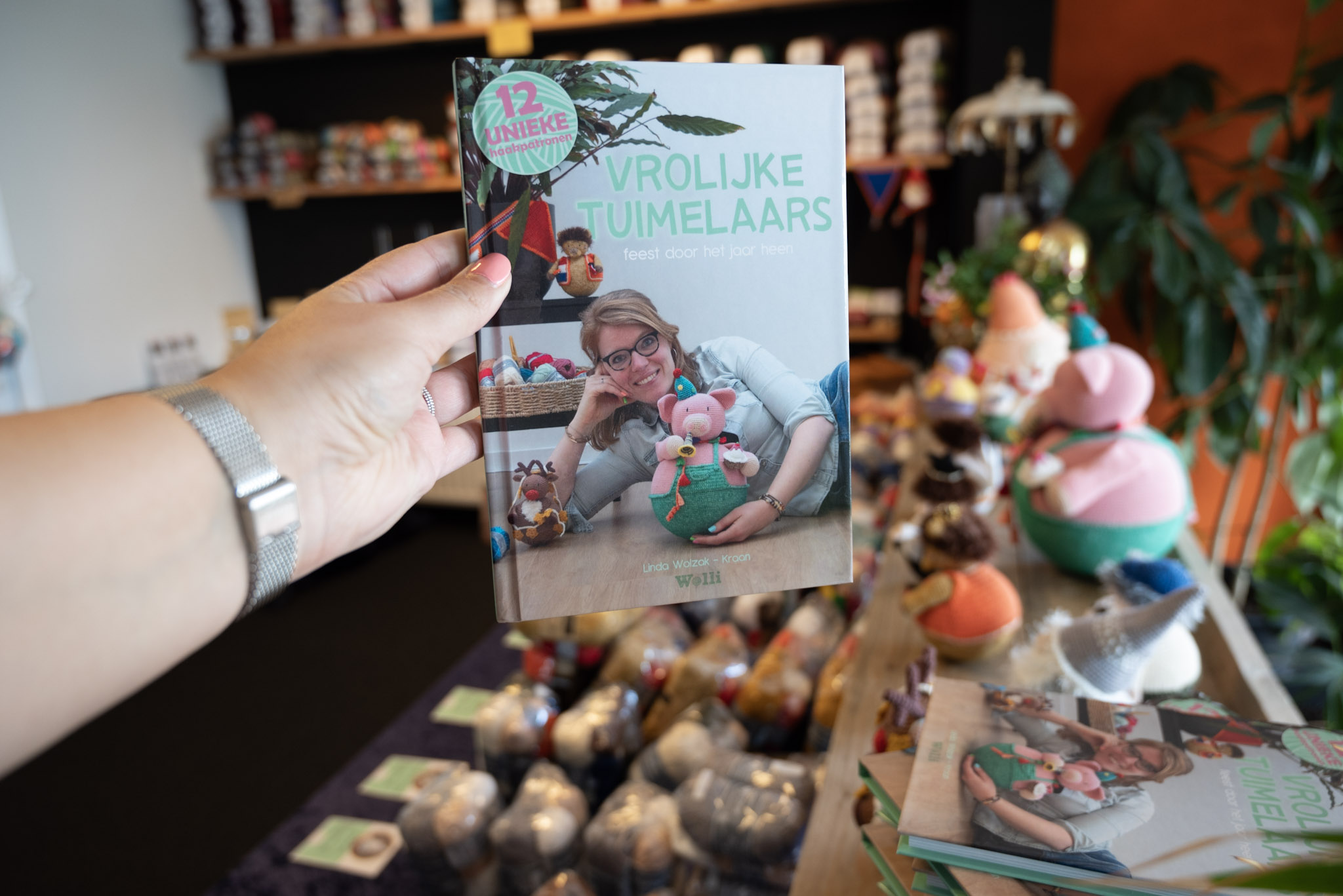 Jaaaa! Naast alle mooie wolletjes en spulletjes vind ik het ook heel leuk om aan eigen patronen te werken. Sommige pakketten zijn dan ook Wolli-ontwerpen. Sinds juni 2024 mag ik daar ook een eigen boek aan toevoegen: ‘Vrolijke tuimelaars, feest door het jaar heen’. Een boek vol met patronen voor tuimelaars in feestthema.