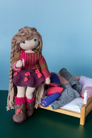 Met dit garenpakket kun je de pop uit 2020, Kayla haken. De poppen uit het boek zijn gehaakt met Scheepjes garens. In het garenpakket van Wolli vind je garens van Durable. Alexa heeft op haar blog de vervangende kleuren geschreven. Het overzicht vind je hier: Blog vervangende garens