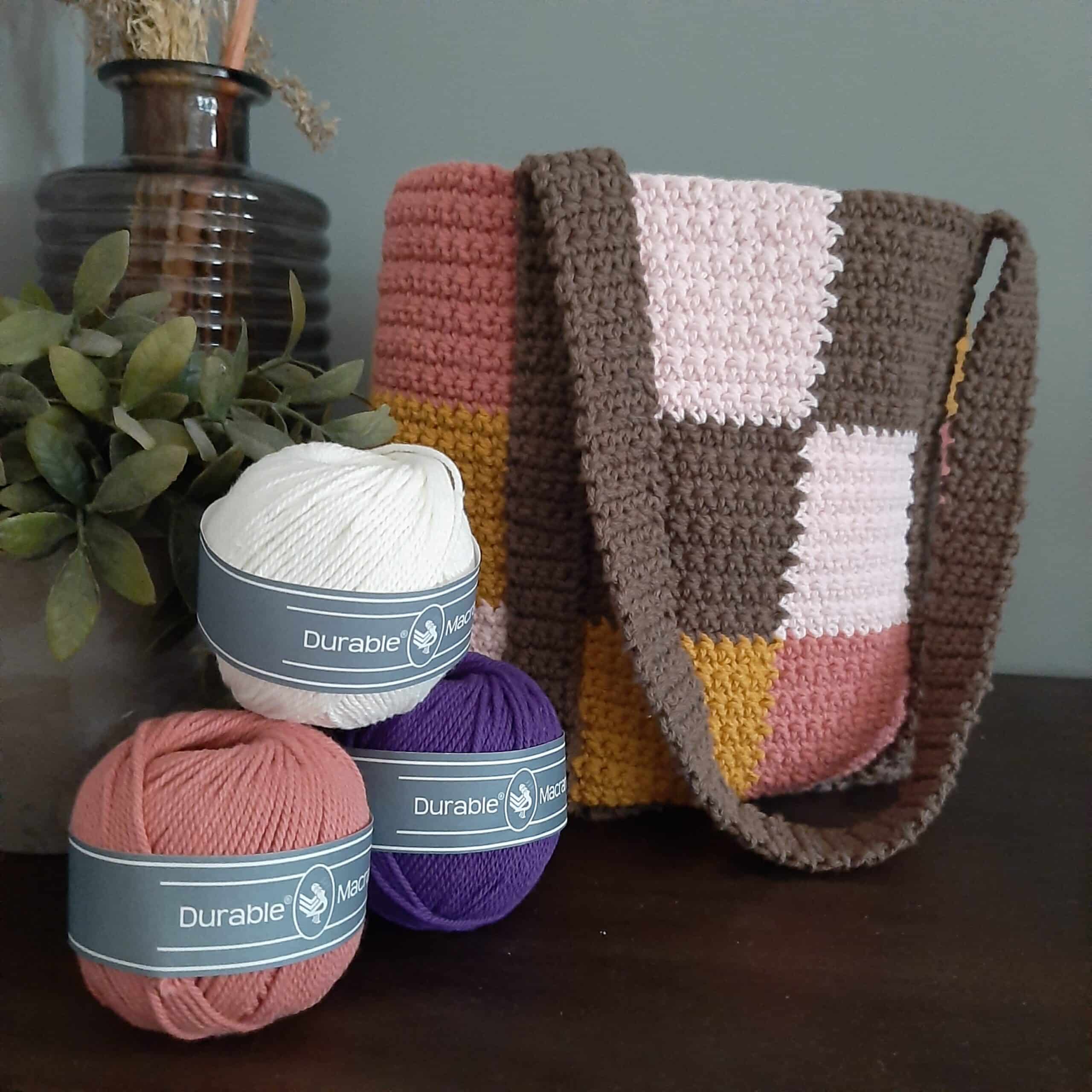 Tassen heb je nooit genoeg toch? Deze vrolijke tas haak je met verschillende kleuren Durable Macrame. Een stevig model die je prima over je schouder kunt dragen.