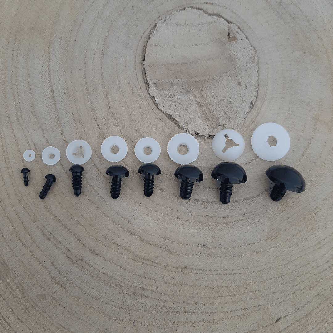 Oogjes om jouw gehaakte amigurumi helemaal af te maken. Deze oogjes steek je door je haakwerk en maak je aan de achterkant vast met het witte dopje.